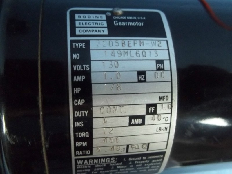 Bodine Gearmotor, 130 V DC, 1 Amp, 1/8 HP.