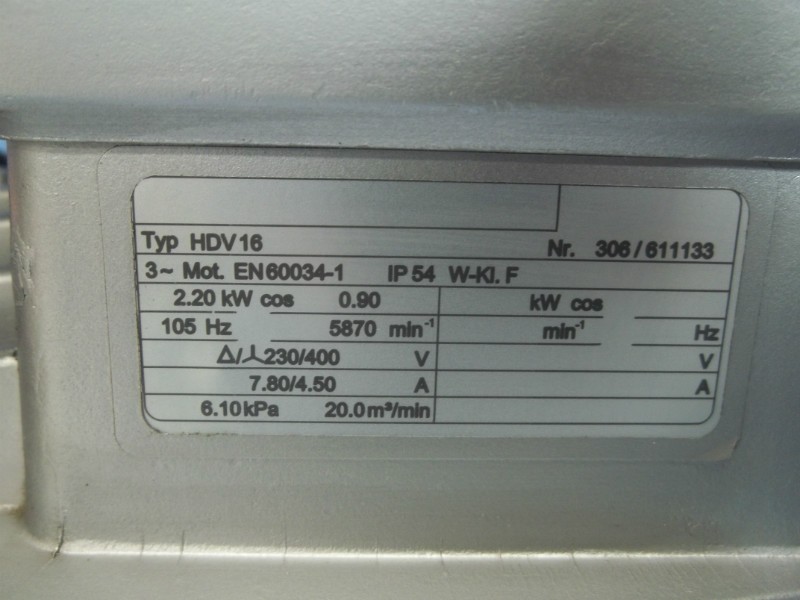 - Capacity: 20 m3/min (= 706.3 cfm) at 61 mbar differential pressure