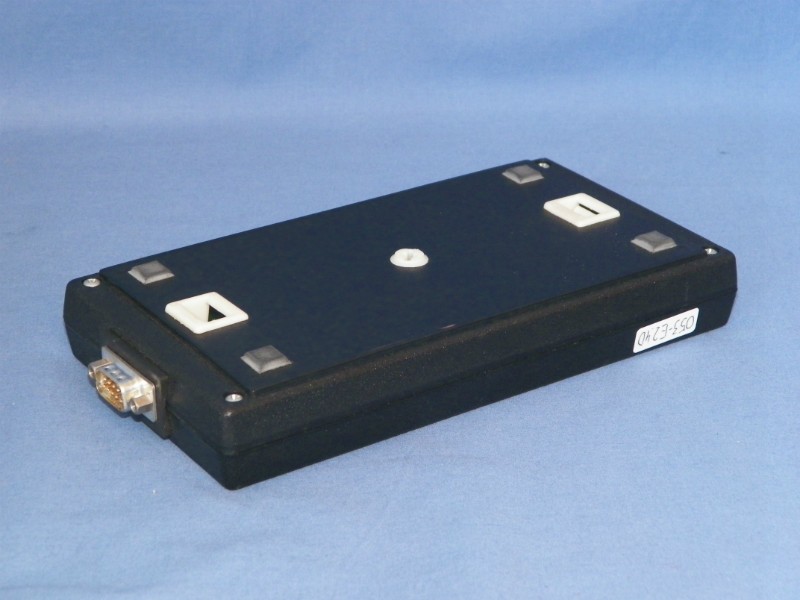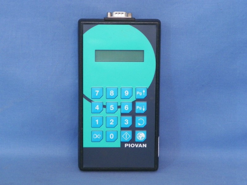 Hand held operator panel for Piovan plastics processing machine with LCD display and 16 membrane keys. Board 25992758 inside. Has 9 pin male connector.