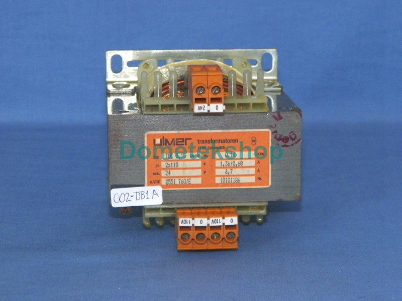 Single phase transformer, primary 2x110 V, secondary 24 Volt, 50/60 Hz. secondary current 6.7A, 160 VA. Made in Germany. Base dimensions 96 mm x 85 mm.