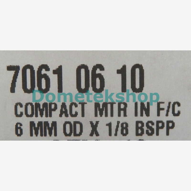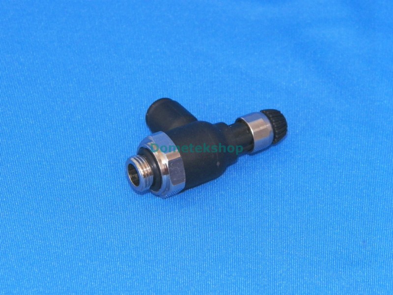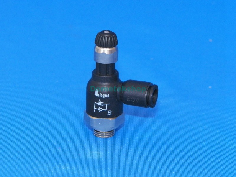 - Air In: BSPP, pipe ID 6.25 mm (1/4"), Air out: 6 mm OD hose push-to-connect, slotted screw for flow adjustment
