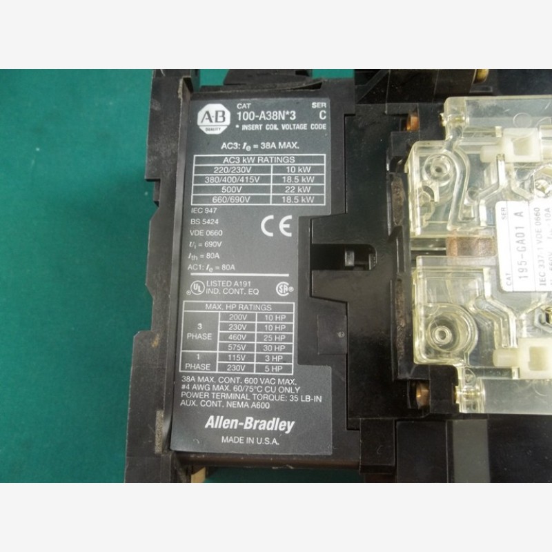 Link to photos on Ebay: Allen-Bradley 100-A38N*3 3-phase contactor with 2 x Allen-Bradley 195-GA01 | eBay