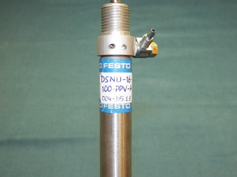 Festo DSNU-16-100 PPV-A Cylinder. max: 10 bar/ 145 psi, 16 mm bore, 100 mm stroke. Single rod, double acting, stainless steel body, rear pivot mount
