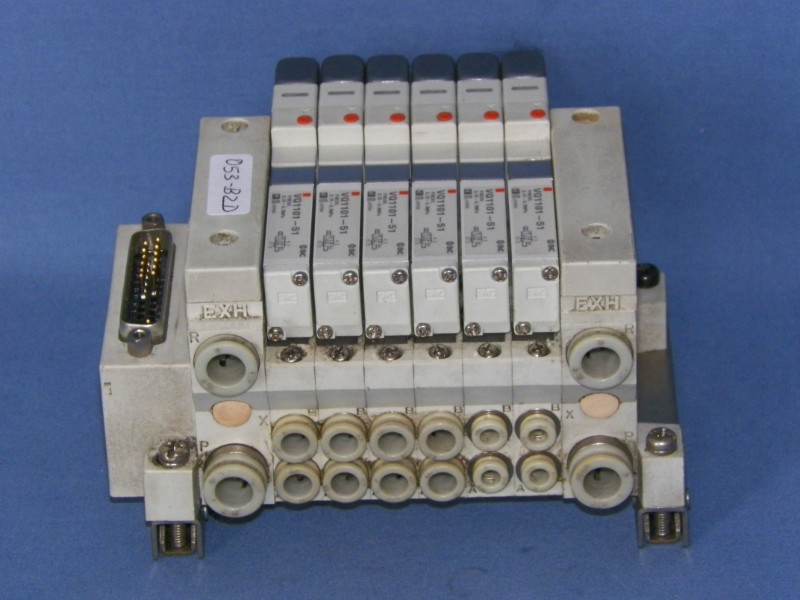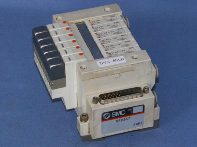 SMC valve block consisting for 6-10mm valves (6 x VQ1101-51), plus air inlet/outlet module, plus interface port SFZ367, plus end pieces.