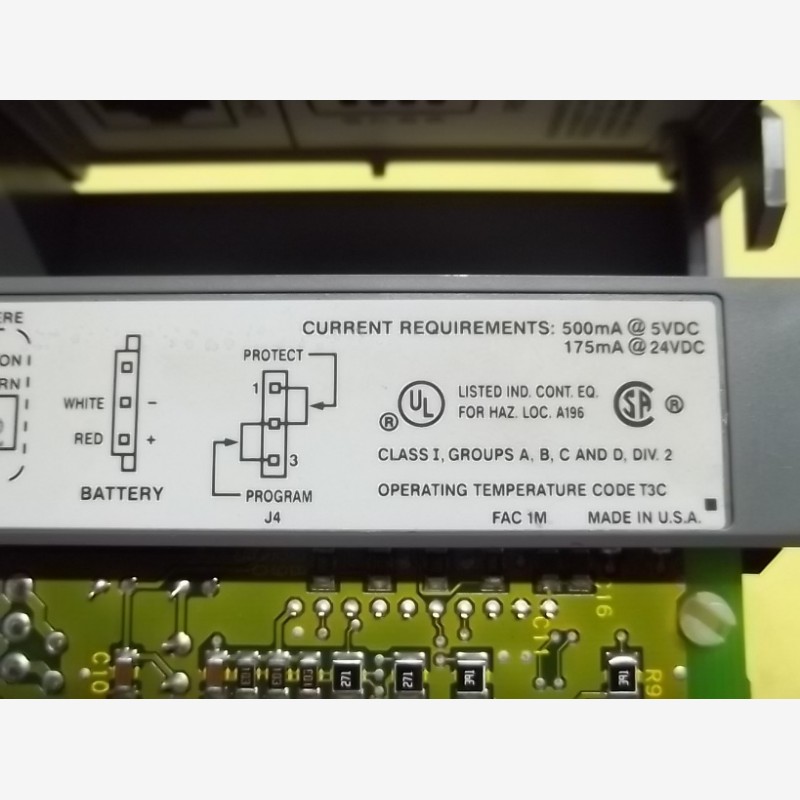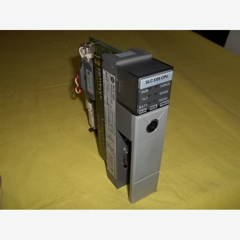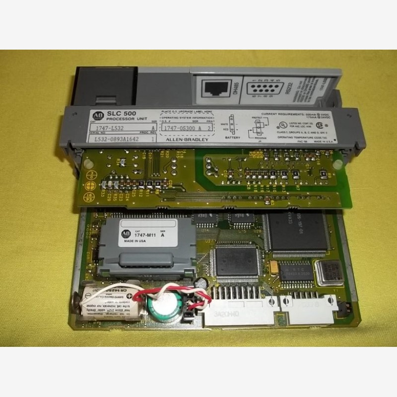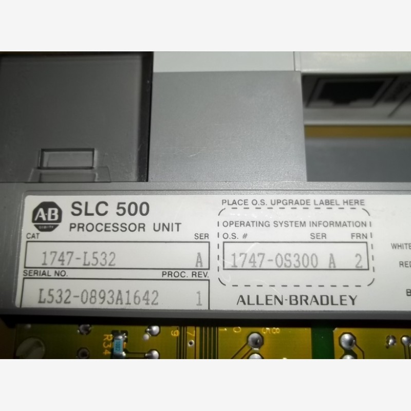 Allen Bradley SLC 500 Processor Unit/ SLC 5/03 CPU 1747-L532, SER A. Serial No. L532-0893A1642. Proc. Rev: 1. Operating system information: O.S. No. 1747-0S300, FRN: 2. Current requirements: 500mA at 5 VDC, 175mA at 24 VDC. Made in USA. This part has been pulled out from working environment.