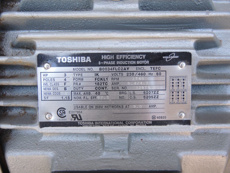 - Complete with 3-phase Toshiba AC motor model B0034FLC2AY, 3 hp, 230/460 V