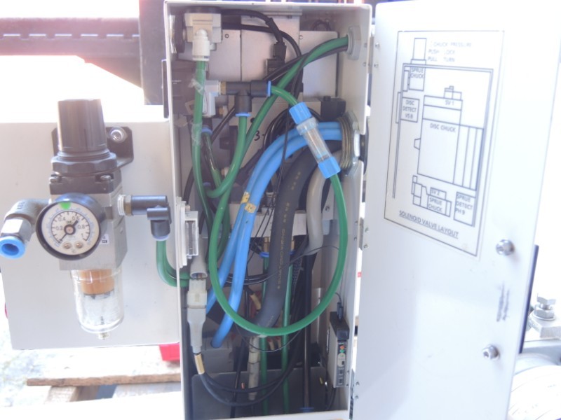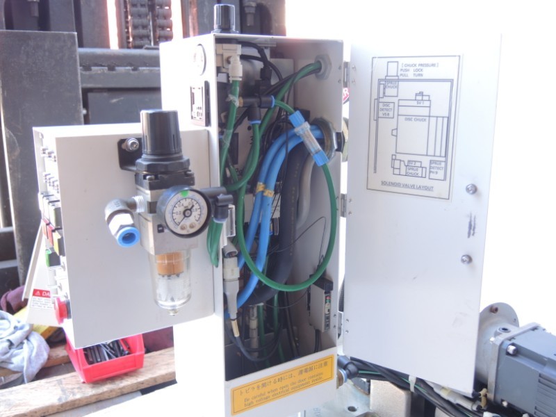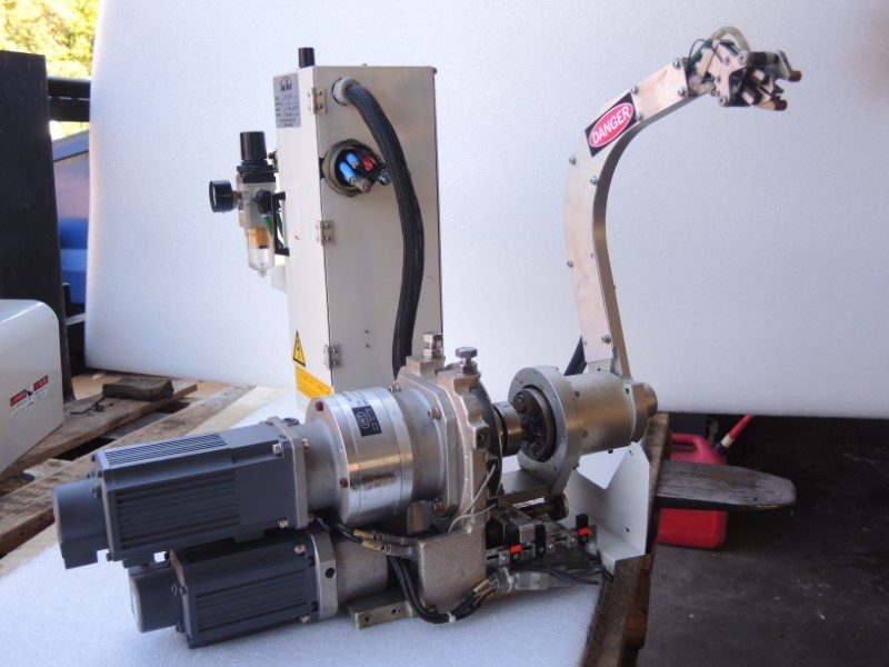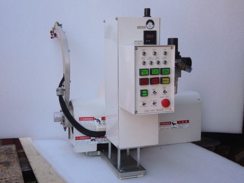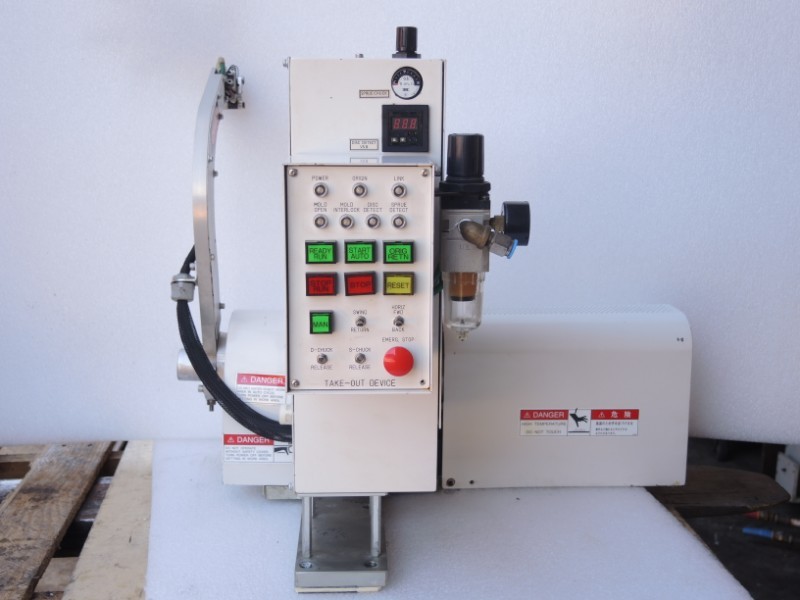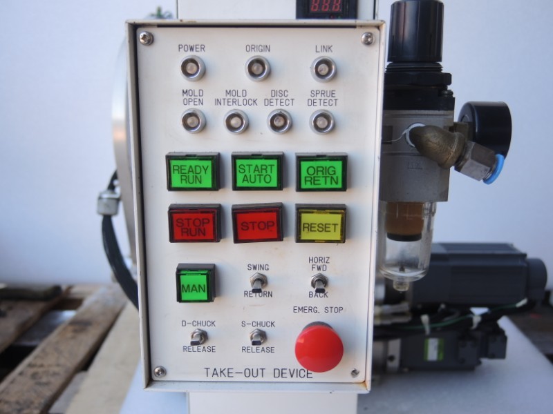 - Servo driven linear movement of arm to touch and remove part from mold before swinging out. (Mitsubishi AC Servo HA -FH33B w. encoder)